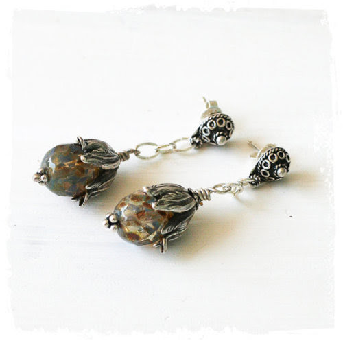 Amber Czech Bead and Silver Petals Victorian Earrings - Romantic Elegant Bohemian Drop Earrings - Holiday Bling